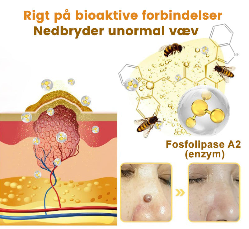 Biergift: Biergift er gift fra de New Zealandske honningbier. Det er en metode, hvor bierne stimuleres til at udskille gift ved hjælp af æteranæstesi. Dette naturlige stof er ikke livsfarligt og anerkendes for sine potentielle fordele i behandlingen af forskellige vorter og hudsygdomme. Det kan regulere immunsvaret og hæmme inflammatoriske cytokiner. Samtidig er biergift en relativt sikker immunmodulator med antivirale egenskaber. Derfor kan det også effektivt behandle virale vorter og dræbe hudcellerne i vorterne, hvilket får dem til gradvist at ændre farve, blive mørkere og falde af indenfor 1-2 uger. Melittin, som vores team har opdaget, har også stærke antiinflammatoriske egenskaber, der hjælper med at reducere inflammation forårsaget af vorterne.