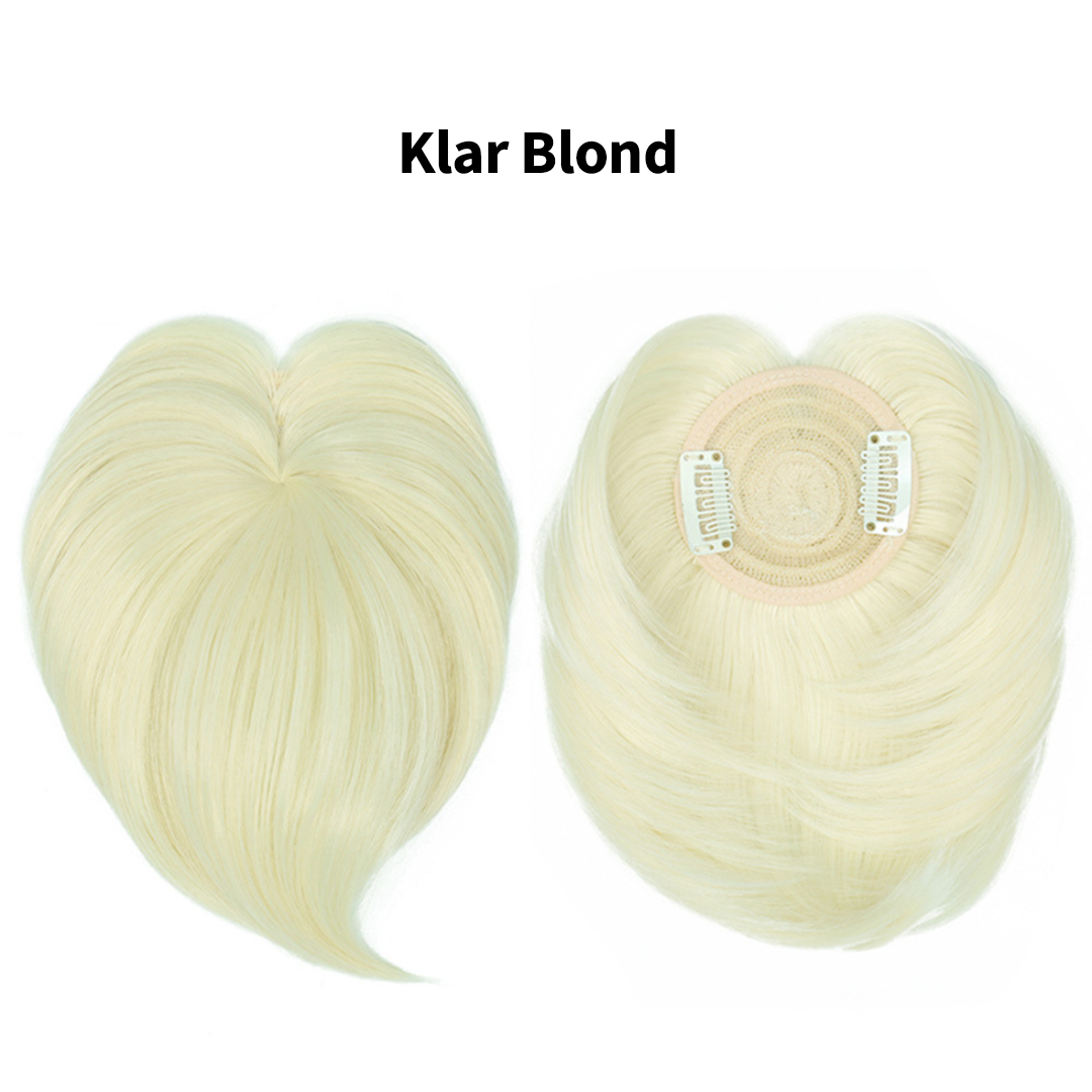 Fastgør topperen med de to skridsikre clips, så den sidder behageligt og sikkert. Blend forsigtigt topperen med dit naturlige hår for et fejlfrit og naturligt look.