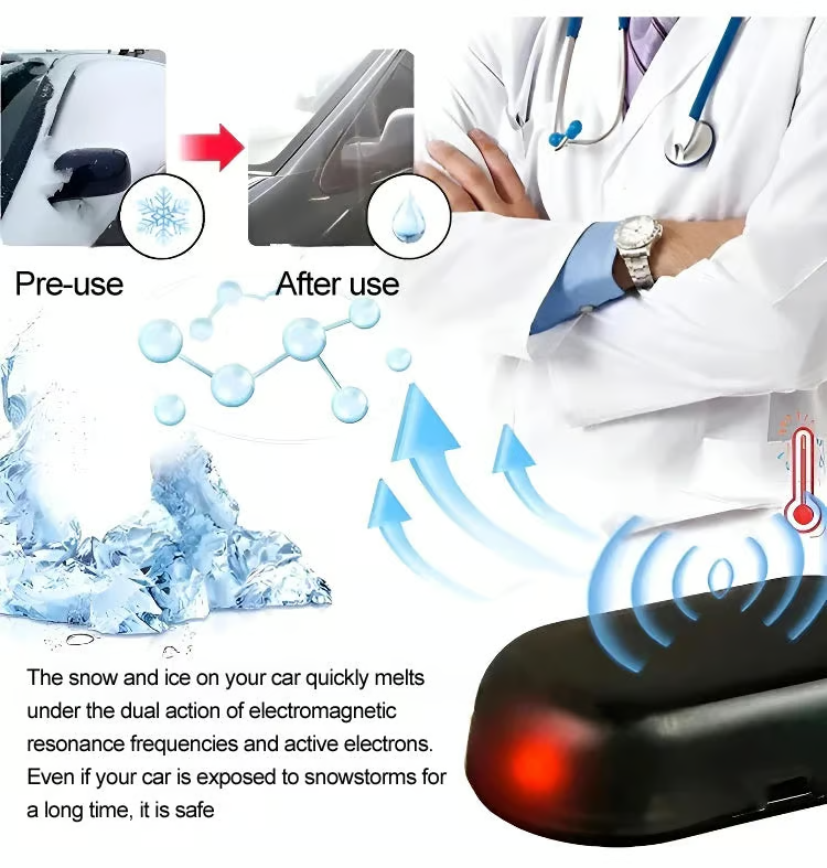 En banebrydende solcelledrevet opfindelse, der fremmer en overlegen afisningseffekt for at levere den hurtigste løsning til at tackle genstridig is fra biler. Den anvender en smart teknologi kendt som »elektromagnetisk molekylær interferens«, der virker ved at aktivere og accelerere den molekylære bevægelse af is og sne. Når molekylernes bevægelse øges, overvinder den desuden den tiltrækning, som vandmolekyler har på hinanden, hvilket resulterer i, at isen på bilens overflade smelter hurtigt. Denne enhed hjælper endda med at forhindre, at vand let størkner, selv ved lave temperaturer, for at sikre, at køretøjer ikke fryser tilbage i sådanne ekstreme miljøer. Den tekniske ydeevne fra NASA gør, at den kan klare temperaturer fra 20 °C til -80 °C - den samme kulde, som findes på Mars' overflade!