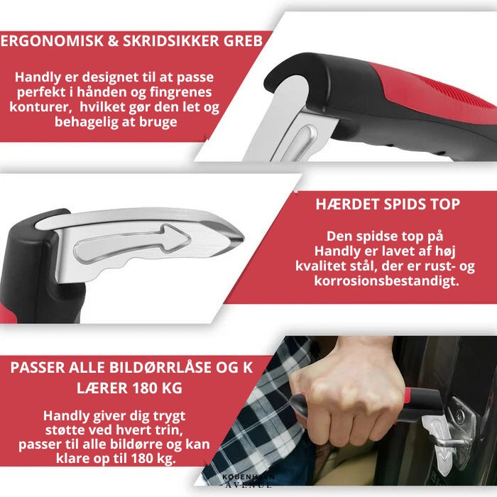 Handly er fremstillet af lette materialer af høj kvalitet og giver stabil støtte til op til 180 kg. Med det polstrede, skridsikre greb og den universelle pasform er den perfekt til enhver bil. Det, der engang var en udfordring, er nu glat, pålideligt og stressfrit.