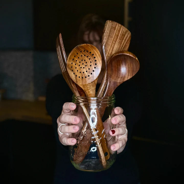 Vælg vores køkkensæt, og undgå den mikroplast, som mange andre redskaber kan udsende. Vores kemikaliefrie, eksklusive redskaber er behandlet med naturlig olivenolie og skabt til dem, der vil have et køkken uden mikroplast og skadelige stoffer.