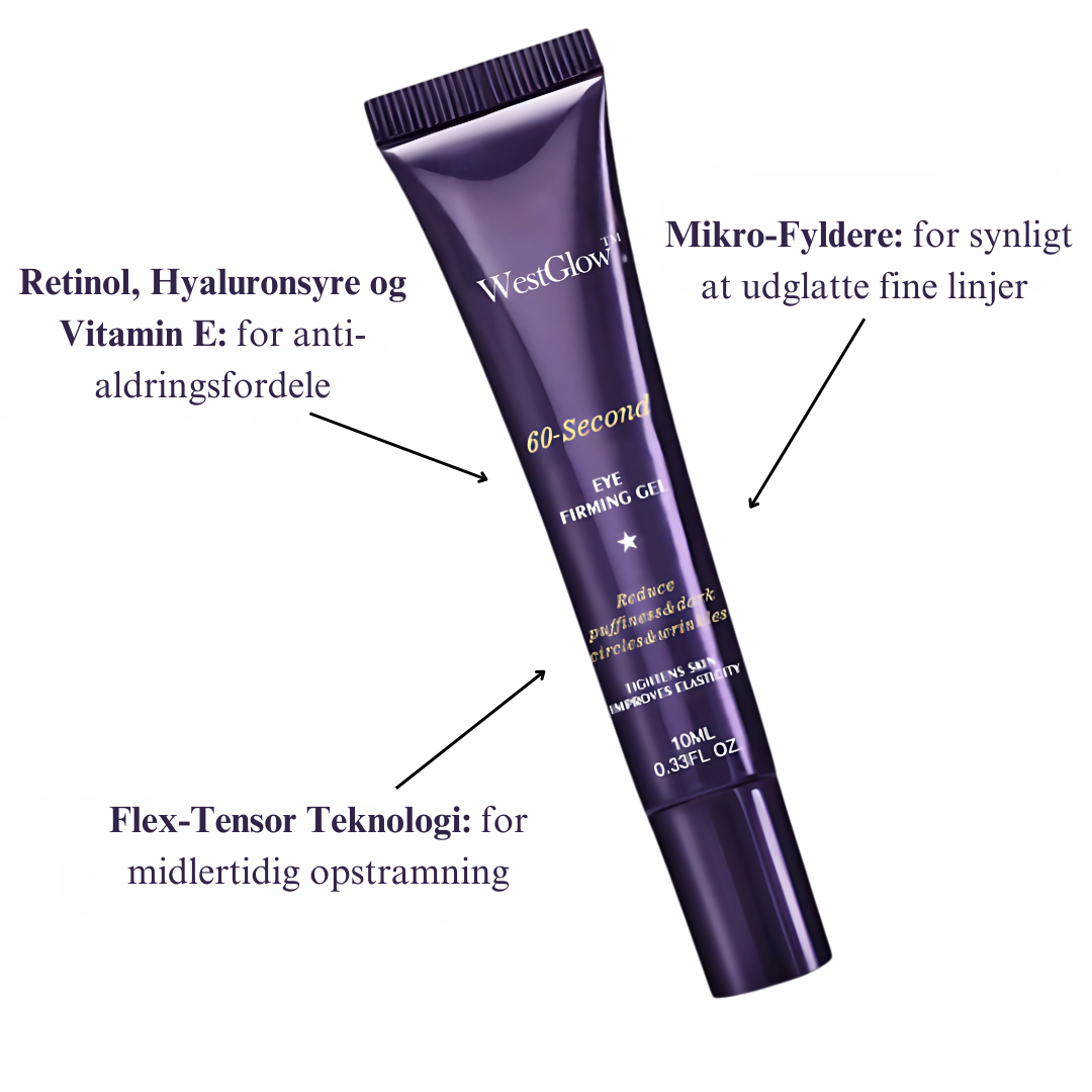 Oplev kraften i WestGlow™ 60-Second Eye Firming Gel, specielt udviklet til øjeblikkelig foryngelse af huden omkring øjnene. Kombinationen af Retinol, Hyaluronsyre og E-vitamin giver intensiv fugt, reducerer fine linjer og rynker og beskytter mod hudens ældning.